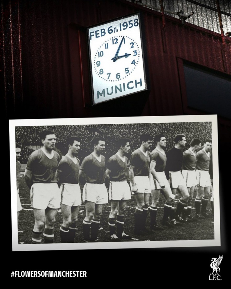 利物浦社媒发布纪念慕尼黑空难的海报,并写道:“值此慕尼黑空难周年纪念日,我们暂停脚步,与曼联同心追思。”